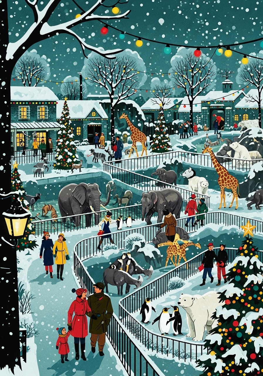 ein bunter weihnachtlicher Zoo mit Lichtern, Schnee und Weihnachtsbäumen und vielen Tieren und fröhlichen Menschen