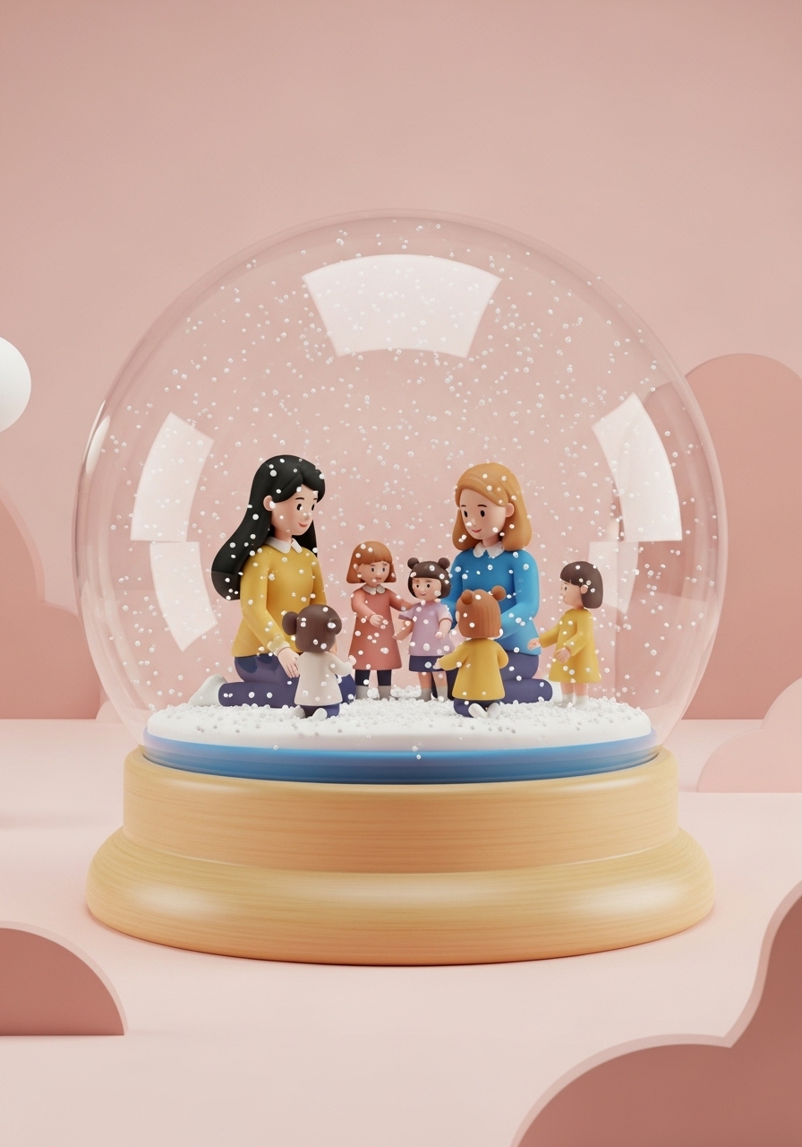 Zwei junge Mütter (eine schwarze lange Haare, die andere blonde mittellange Haare) verbringen Zeit mit den 5 kleinen Mädchen.